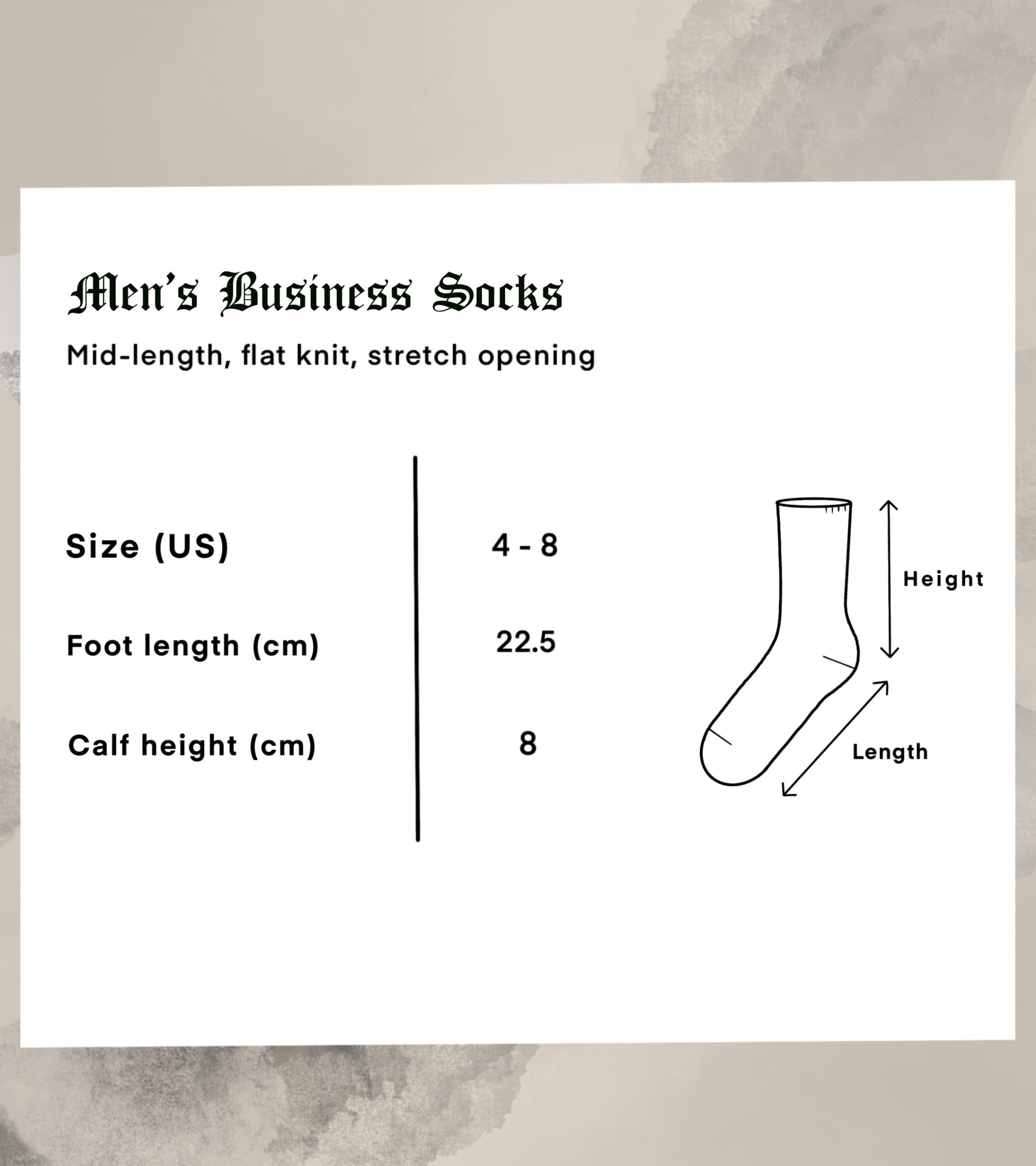 Regular-length, knitted ribbed neck, stretch opening, breathable, circulation friendly, cotton-rich blend, thick knit foot base.